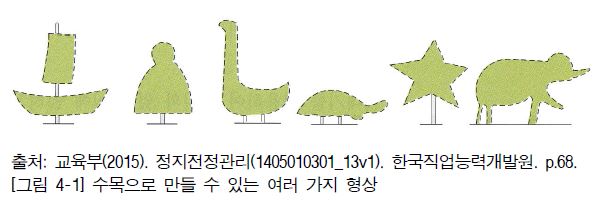 형상수의 형태 및 역할을 고려하여 상록침엽수와 낙엽활엽수의 적용가능성을 이해하고, 전정을 통해 형상수를 형성할 때 잔가지와 맹아의 발생이 형상수 수형에 미치는 영향을 파악한다.