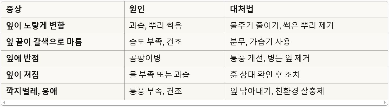 * 너무 건조하면: 잎 끝이 갈색으로 마르거나 잎이 떨어질 수 있습니다
