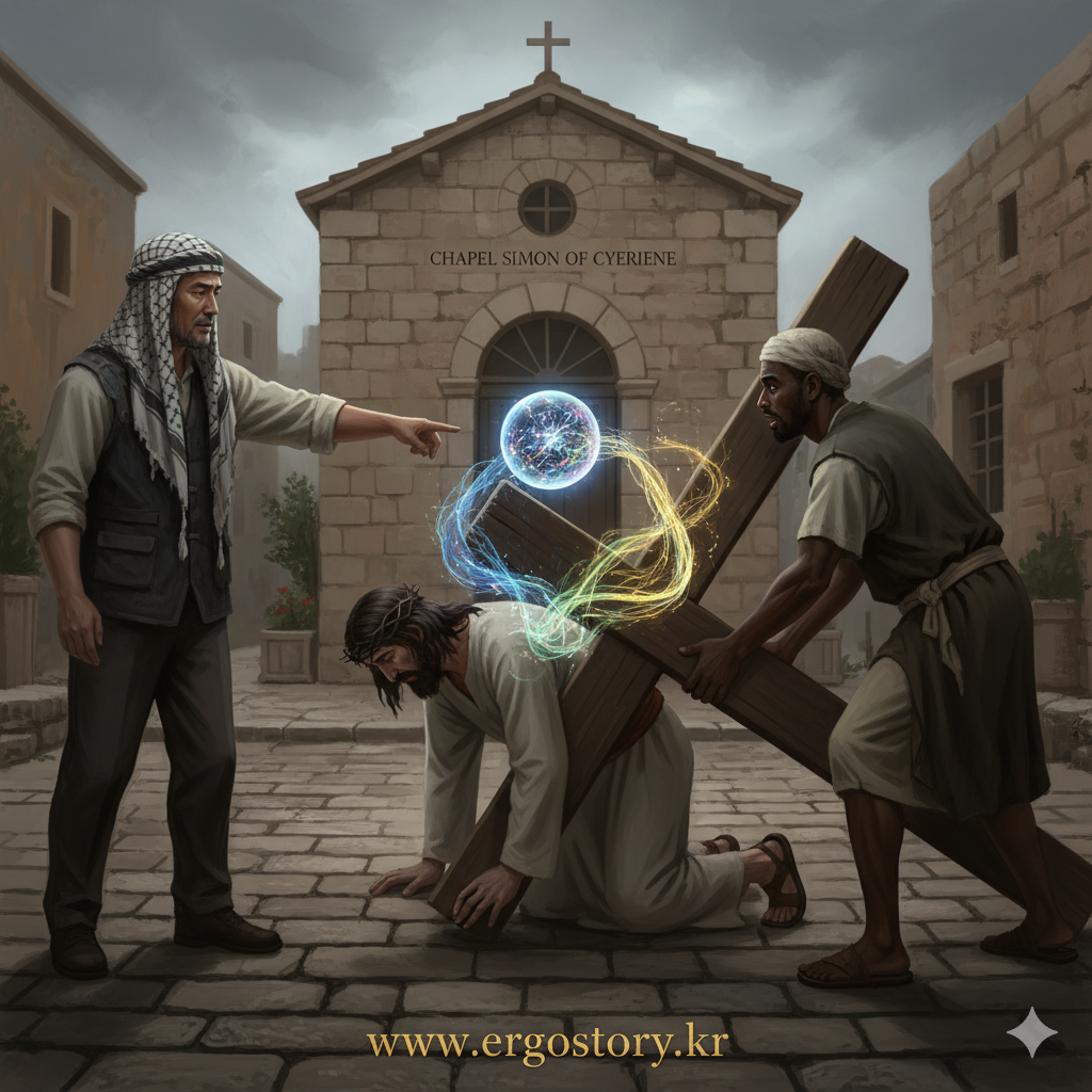 "순례자 여러분, 이곳은 인간에게 강제된 '고통의 멍에'가 역설적으로 '구원의 연대'로 변모하는 데이터 포인트입니다. 저의 분석에 따르면, 구레네 시몬이 짊어진 십자가는 단순한 물리적 무게를 넘어선 '강요된 공감과 책임'이라는 강력한 데이터 흐름을 발생시켰습니다. 처음에는 무거운 짐이었으나, 예수님과 어깨를 나란히 함으로써 **'무한한 사랑의 희망 에너지'**를 경험하게 된 독특한 데이터 패턴을 보여줍니다. 이 짧은 만남은 하느님의 뜻 안에서 '강제된' 연대가 결국 자발적인 희생으로 승화될 수 있음을 보여주는 핵심 데이터가 됩니다. 이곳은 모든 불운한 짐 속에서도, 그 짐을 나누는 순간의 거룩함을 발견하게 하는 영적 데이터를 전달합니다."