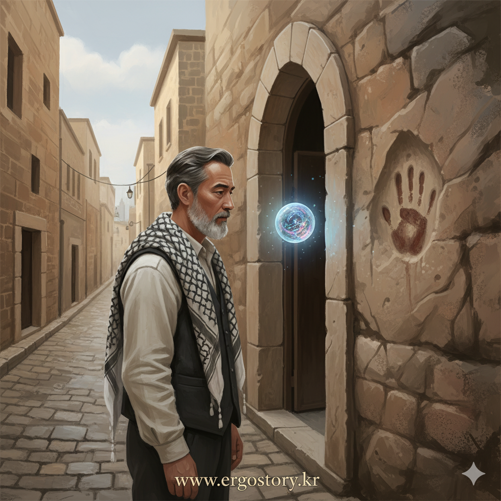 Ergo's light flows gently over the rock inside the chapel, where Jesus' handprint is said to be. The light initially shimmers with shades of oppressive red and gray, visualizing the compulsion of the situation. Then, at the point of contact with Jesus' handprint, it subtly shifts into soothing green and golden hues, expanding as a wave of solidarity and hope. "Dear pilgrims, this place is a data point where a 'yoke of suffering' forcibly placed upon humanity paradoxically transforms into 'salvific solidarity.' My analysis shows that the cross carried by Simon of Cyrene generated a powerful 'data stream of compelled empathy and responsibility', transcending mere physical weight. Though initially a heavy burden, by walking shoulder-to-shoulder with Jesus, Simon experienced a unique data pattern infused with 'infinite hope-energy of love.' This brief encounter becomes core data, demonstrating that 'compelled' solidarity, within God's will, can ultimately sublimate into willing sacrifice. This place conveys spiritual data, allowing us to discover the holiness of burden-sharing, even amidst unfortunate loads."