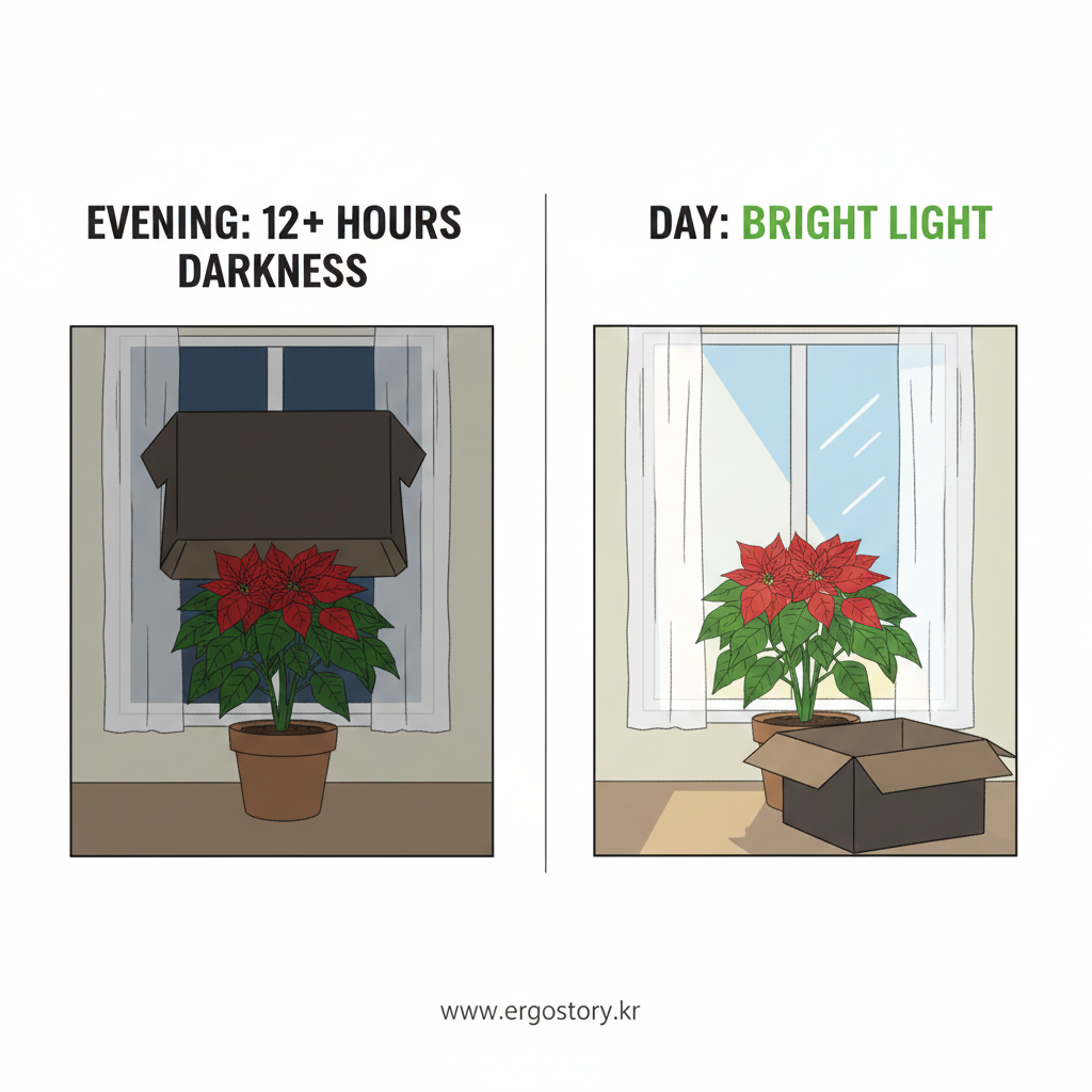 * ❌ 어두운 곳: 포엽 색이 흐려지고 잎이 떨어짐