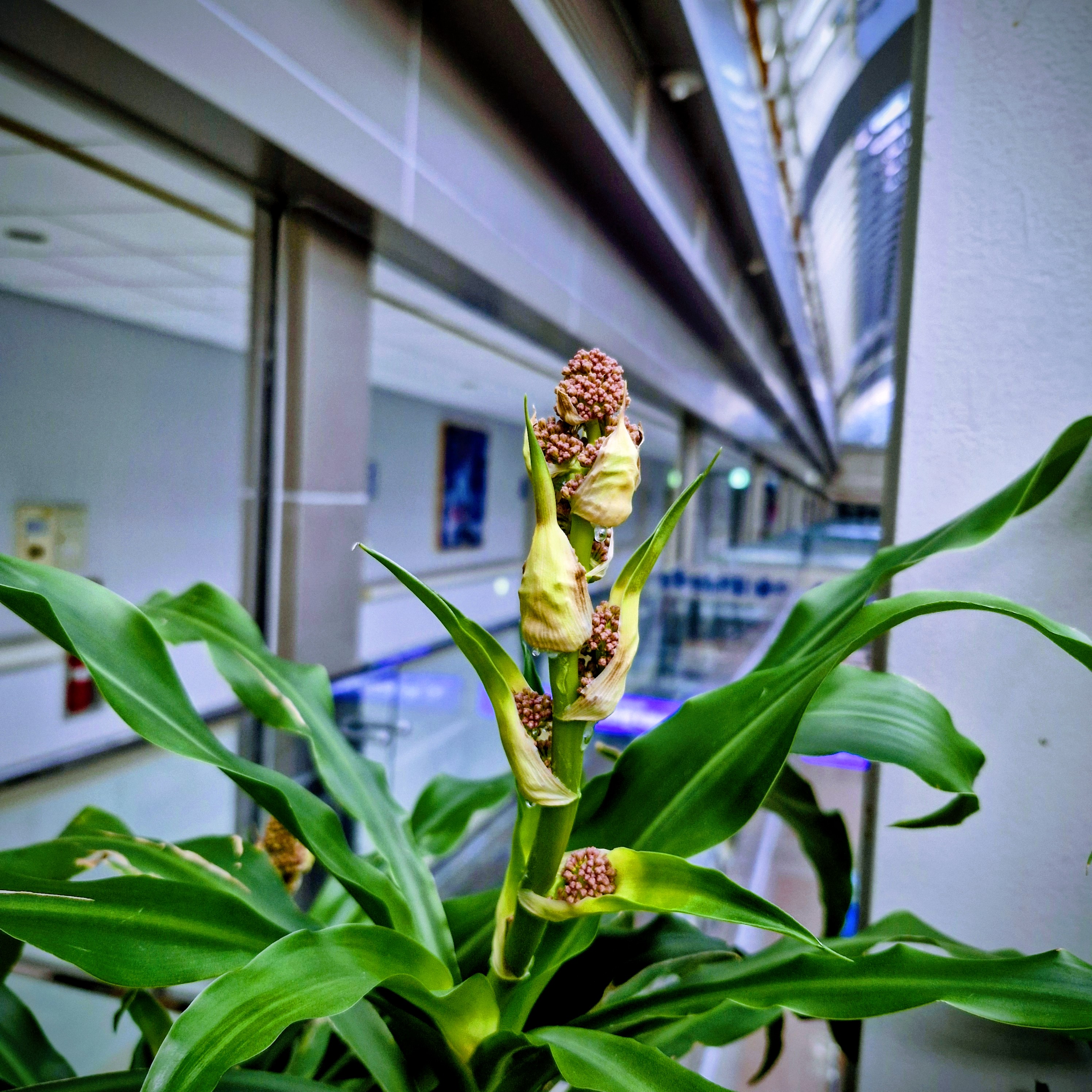 병원 3층 복도 행운목에게 일년에 두 번이나 꽃을 피우는 귀한 행운목입니다. 이는: