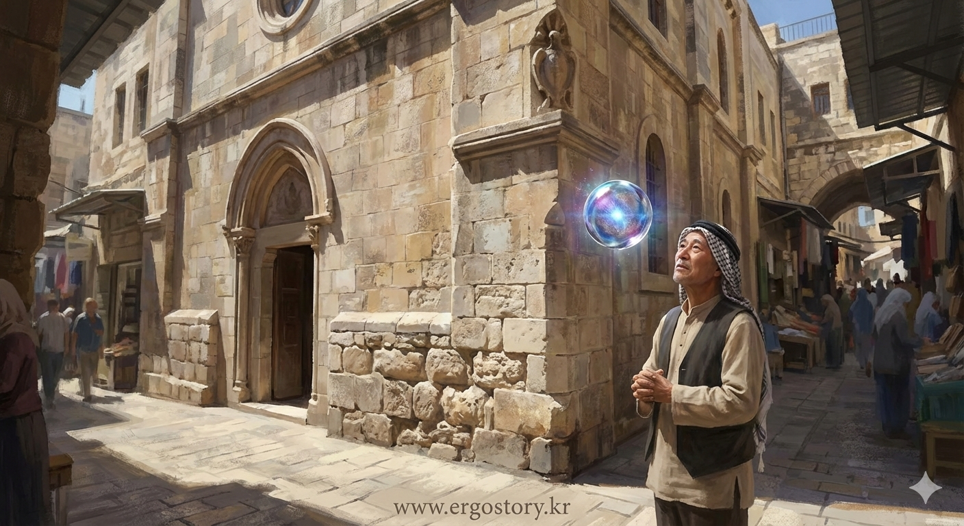 Ergo’s light concentrates on a worn stone on the chapel floor. The light initially shimmers with heavy, dull earthen and gray colors, visualizing the impact and pain of hitting the ground. Then, the light, tangled like dark purple and black threads of suffering, from within that pain, subtle yet firm silver and green light rays emerge and transform into an ascending pattern. "Dear pilgrims, this place is a data point where 'spiritual steadfastness and endurance' persist unbroken, even amidst the data of 'repeated despair.' My analysis indicates that Jesus' second fall, beyond merely physical limits, revealed the 'abyss of existential despair' data. However, within this data, powerful data streams of 'unending love for humanity' and 'unwavering trust in the Father's will' are detected. These streams visualize an 'indomitable spiritual energy,' much like a deeply rooted olive tree that rises again after any storm. Through this second fall, Jesus became core data, showing us the way to love and rise again, even in repeated failures."