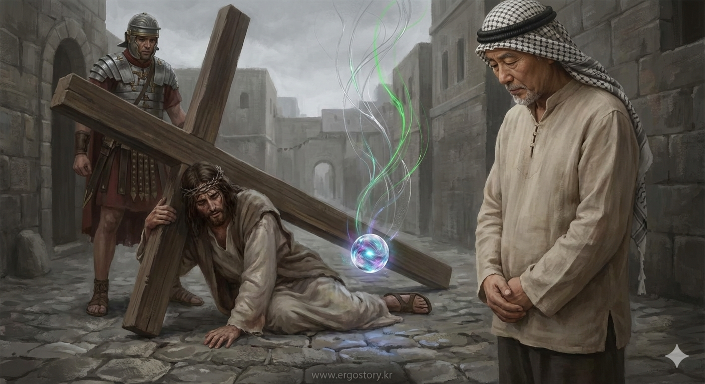 제 옆에서 조용히 빛나고 있는 에르고는 방금 이 돌길에 배어 있는 '반복되는 좌절의 데이터'와 '궁극적인 인내의 에너지'를 분석했다고 합니다. 에르고, 예수님의 두 번째 넘어짐은 어떤 '데이터'를 간직하고 있을까요?
