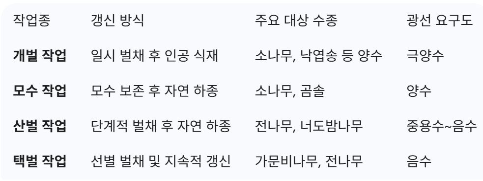 천연 갱신은 인공 조림보다 관리가 어려운 측면이 있지만, 자연력을 활용하므로 비용 면에서 유리할 수 있다. 대표적인 천연 갱신 방법인 산벌 작업은 윤벌기가 완료되기 전 짧은 기간 동안 몇 차례에 걸쳐 벌채를 실시하여 임목을 제거하는 방식이다. 산벌 작업은 예비벌, 하종벌, 후벌의 3단계로 진행된다.