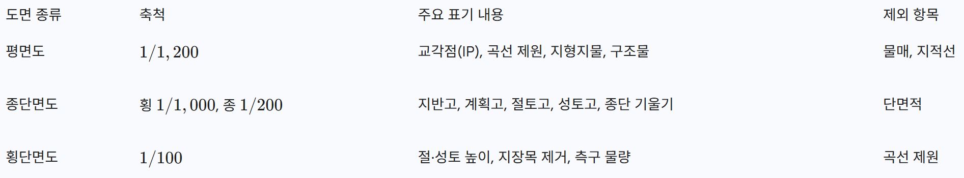 설계도면은 현장 작업자의 시공 지침서 역할을 하므로 법정 축척과 기입 사항을 엄격히 준수해야 한다. 평면도는 노선의 수평적 위치를, 종단면도는 노선의 수직적 높이 변화를, 횡단면도는 도로의 단면 형상을 보여준다.