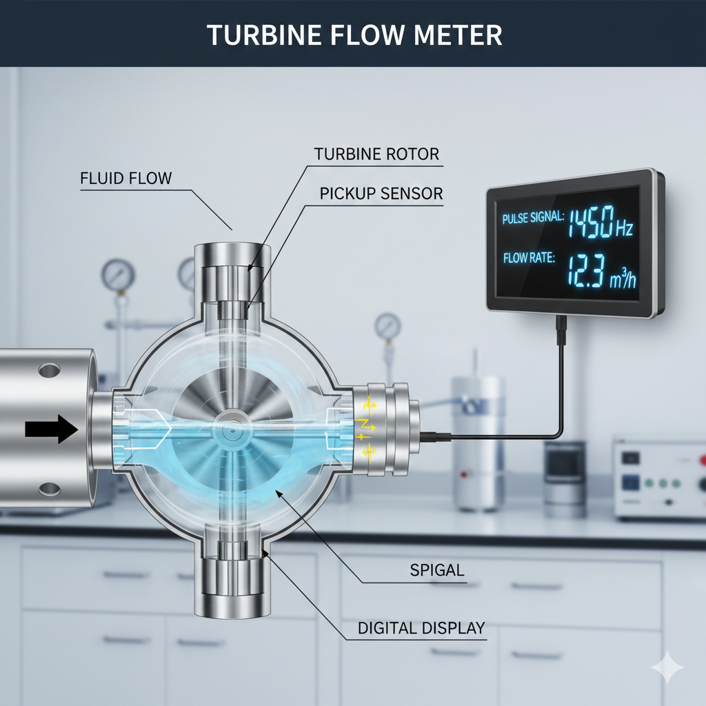 터빈식은 회전하는 터빈 날개의 회전 속도가 유량에 비례하므로, 회전수를 계수로 변환하여 유량 계산