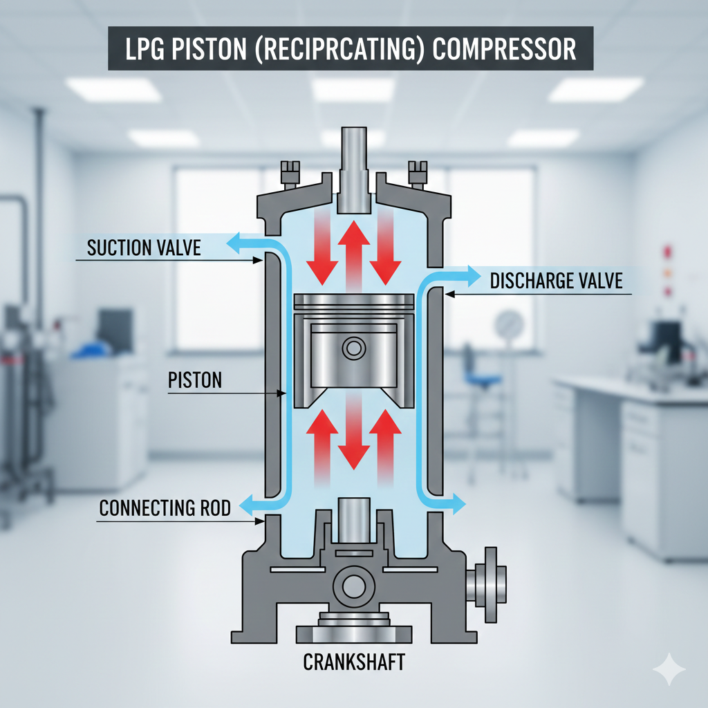 - 피스톤식(왕복식): 피스톤의 왕복운동으로 압축 (저압용 LPG 충전)