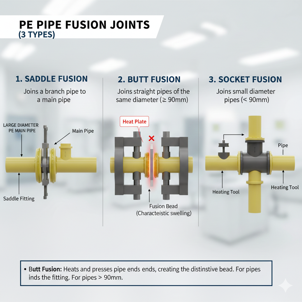 - 새들 융착(Saddle Fusion): 큰 관에서 가지배관 연결 시 사용